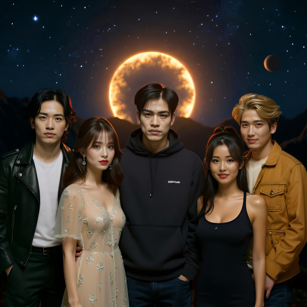 Meet the band: Kairos, the commanding band leader with a rock tinged fire; Lyra, the ethereal soprano whose angelic voice uplifts the band with harmony and beauty; Draven, the dark edged rapper producer balancing shadow and light; Aeris, the emotive vocalist dancer who moves our songs like the wind; and Solen, the mood maker.